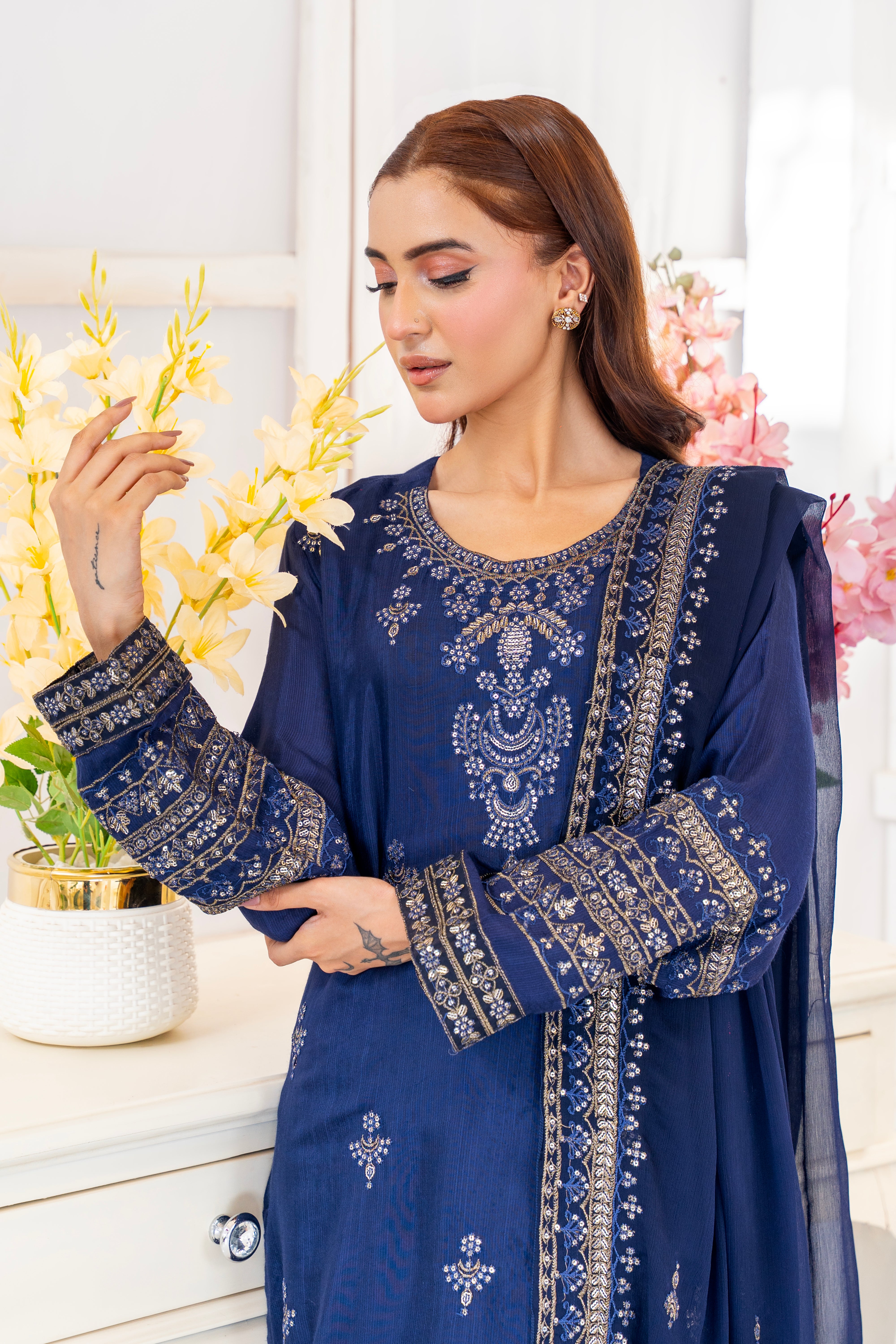 Siyah is a beautifully crafted navy-blue ensemble adorned with elegant silver and blue embroidery. The detailed motifs on the neckline, sleeves, and hem create a refined, luxurious look, while the matching embellished dupatta adds graceful charm.